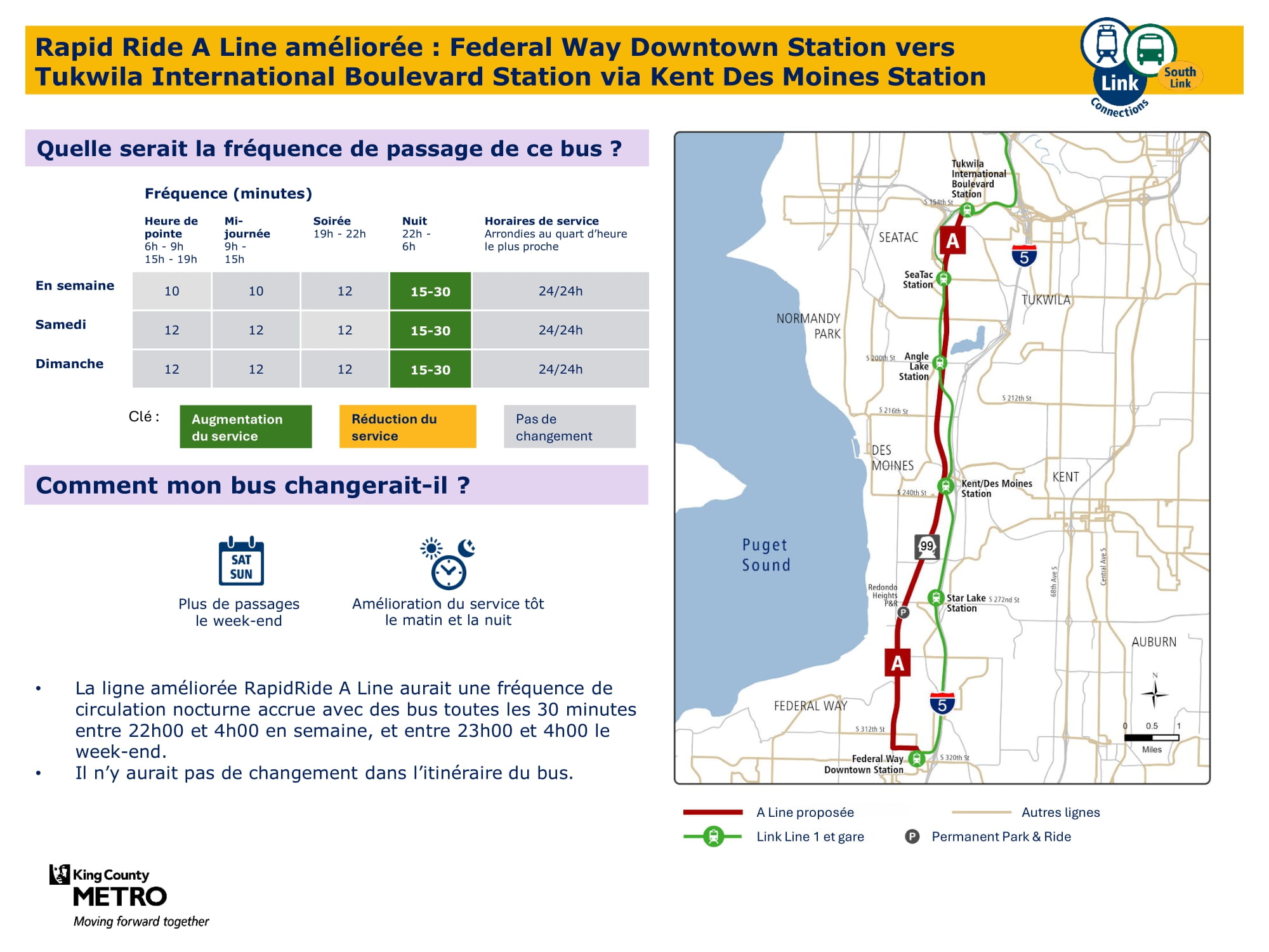 - Extension du service le week-end : Introduction de nouveaux services le samedi et le dimanche, et augmentation de la fréquence sur les axes principaux. Concrètement, le projet prévoit l’introduction d’un nouveau service le week-end à Burien, la mise en place d’un nouveau service le dimanche entre Kent et Federal Way, ainsi qu’une augmentation de la fréquence des services le week-end entre la station Kent Des Moines, la station Kent, Kent East Hill et Green River College. La proposition finale prévoit 57 % de trajets supplémentaires le samedi et presque deux fois plus de trajets le dimanche par rapport à aujourd’hui.