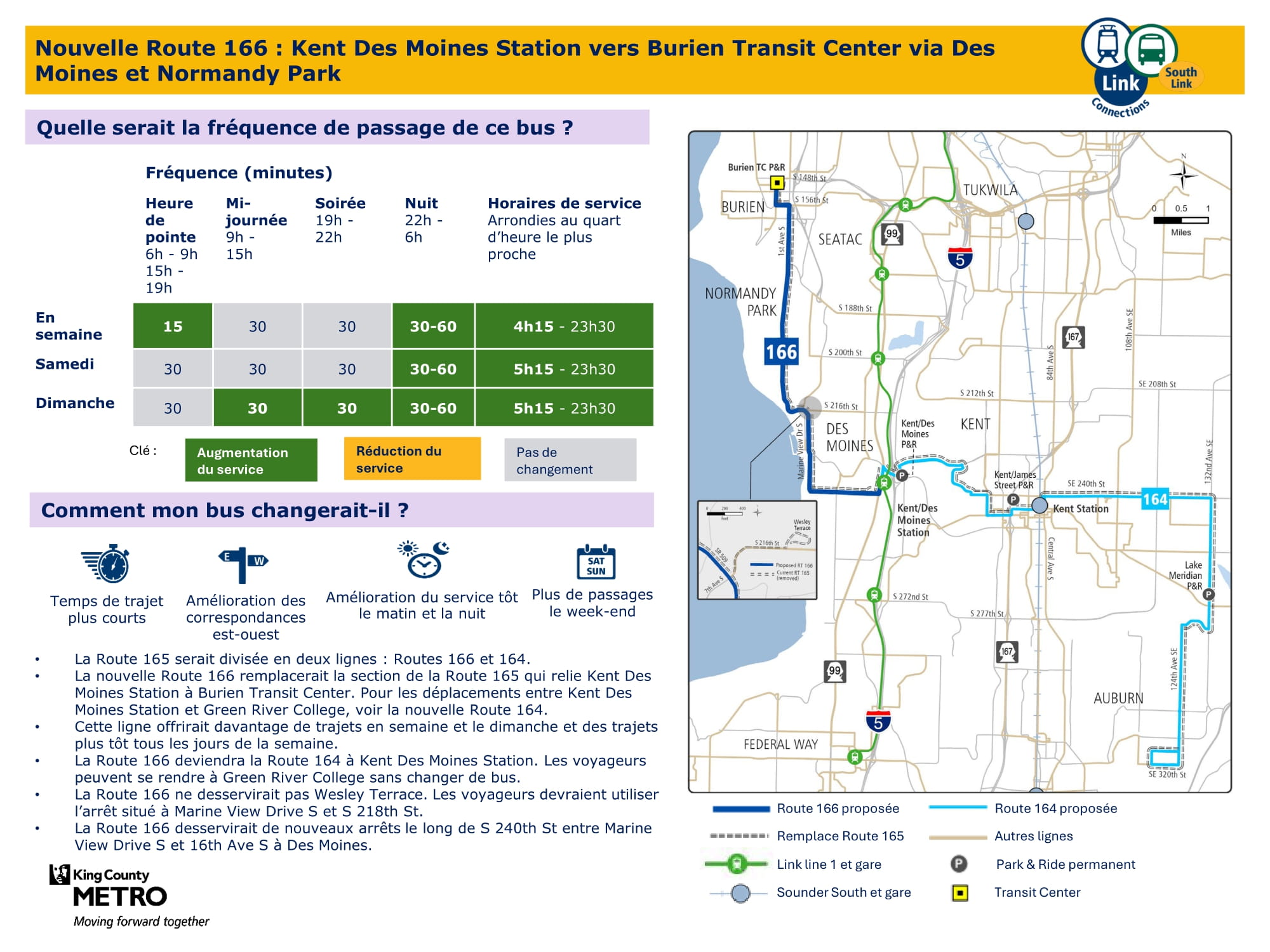 Nouvelle ligne offrant une fréquence élevée aux heures de pointe et un plus grand nombre de trajets chaque jour de la semaine. Remplace une partie de la ligne 165. Assurera une correspondance avec le train léger Link à la station Kent Des Moines. Pour les voyageurs allant au-delà de la station Kent Des Moines, tous les trajets seront désormais assurés par la ligne 164. Découvrez comment les lignes 164 et 166 fonctionneront |