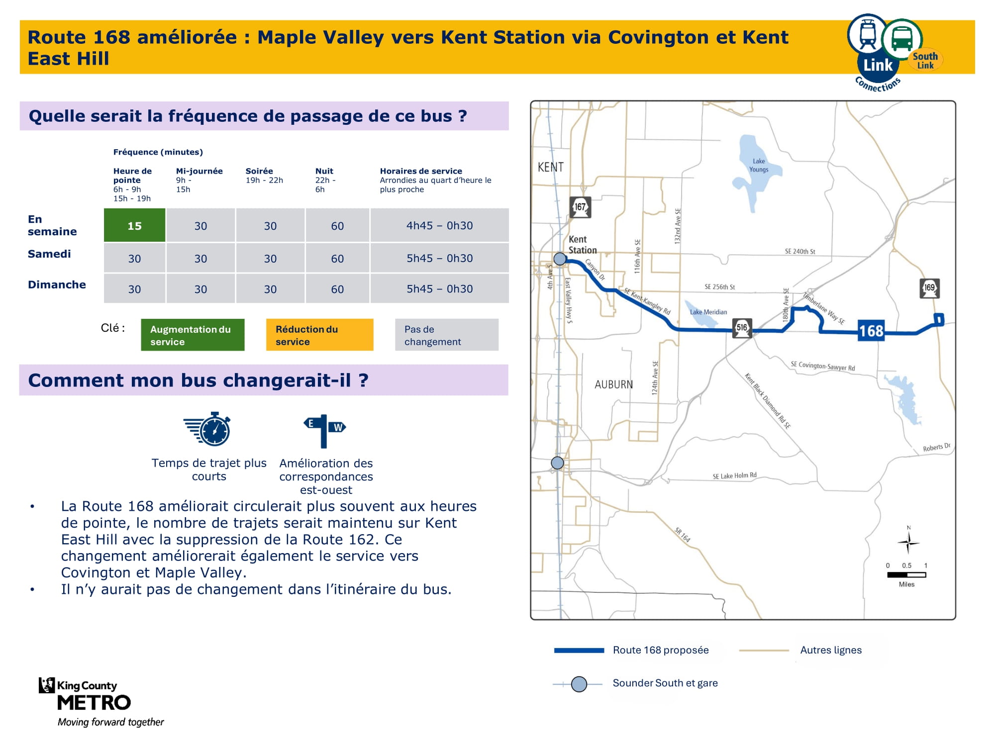 Amélioration avec plus de voyages tous les jours de la semaine. Connexion avec le train léger Link à la station Kent Des Moines et aura une ligne plus directe à travers McMicken Heights. |