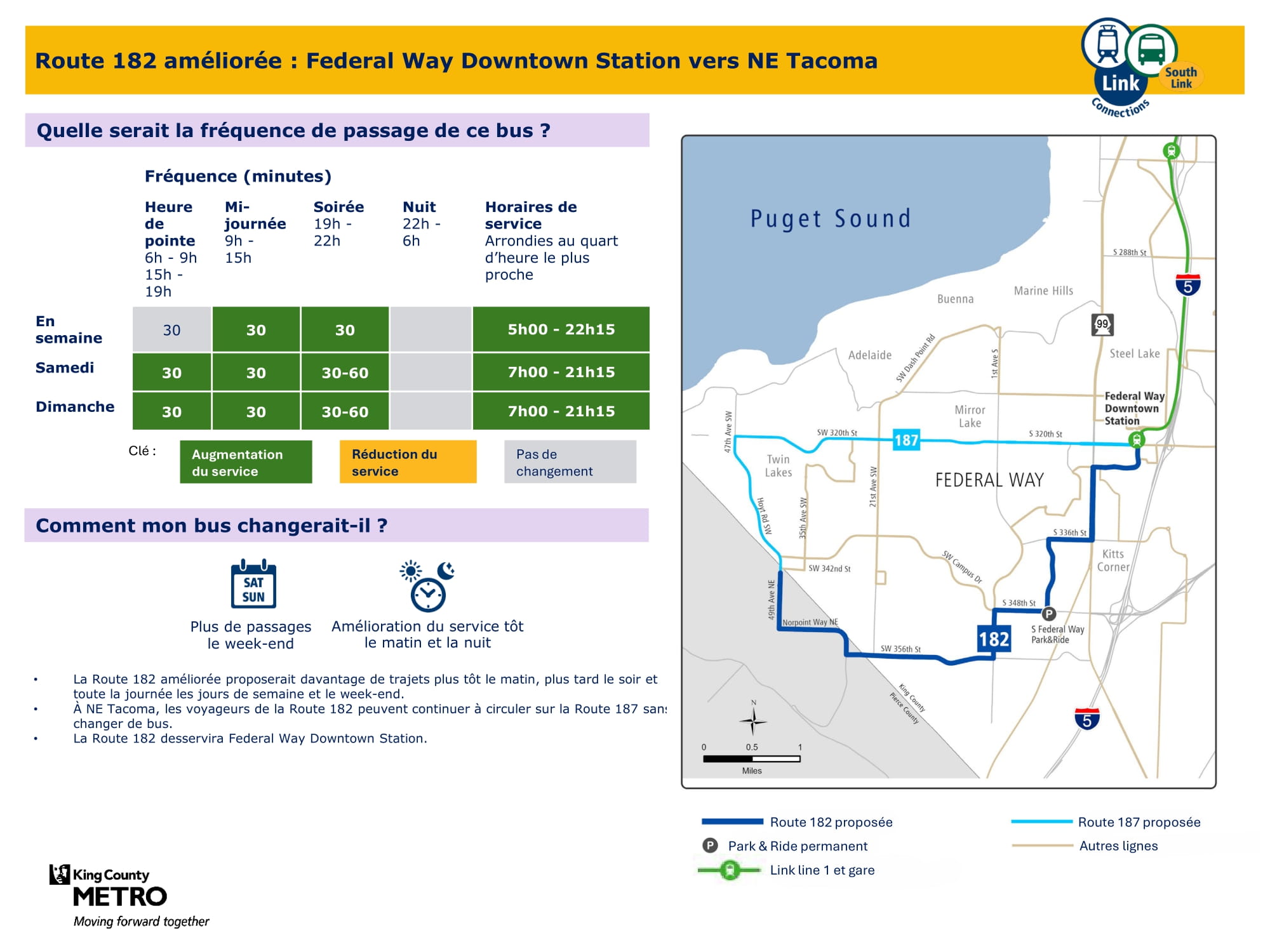 Amélioration avec plus de trajets tous les jours de la semaine. Liaison avec le train léger Link à la station Federal Way Downtown. |