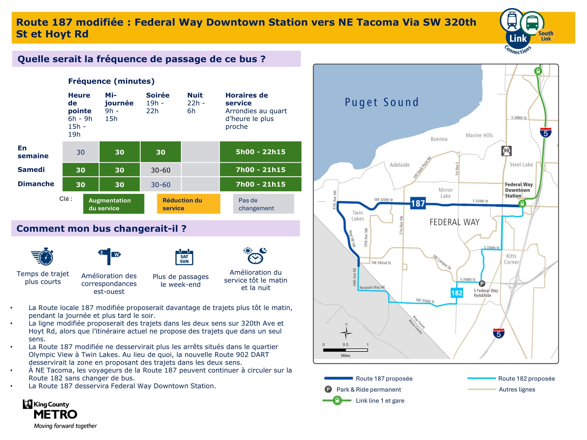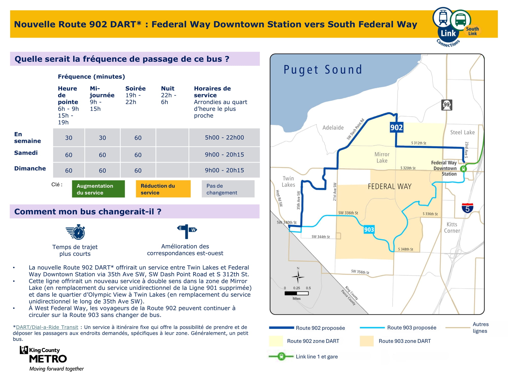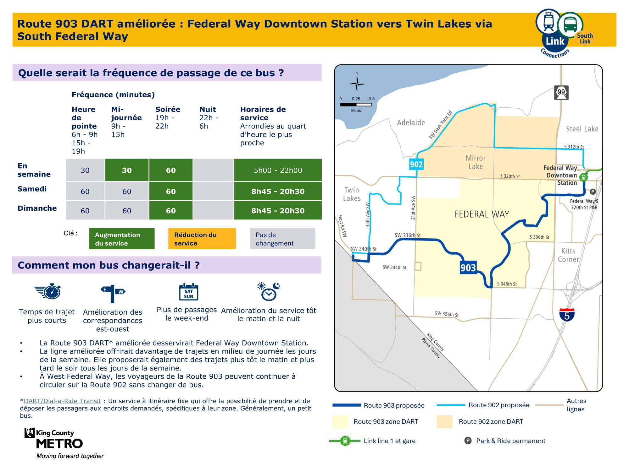 - Service plus rapide : Mise à jour des lignes de bus entre Federal Way et le centre-ville de Federal Way afin de rendre les trajets plus rapides, plus directs et plus faciles à comprendre.