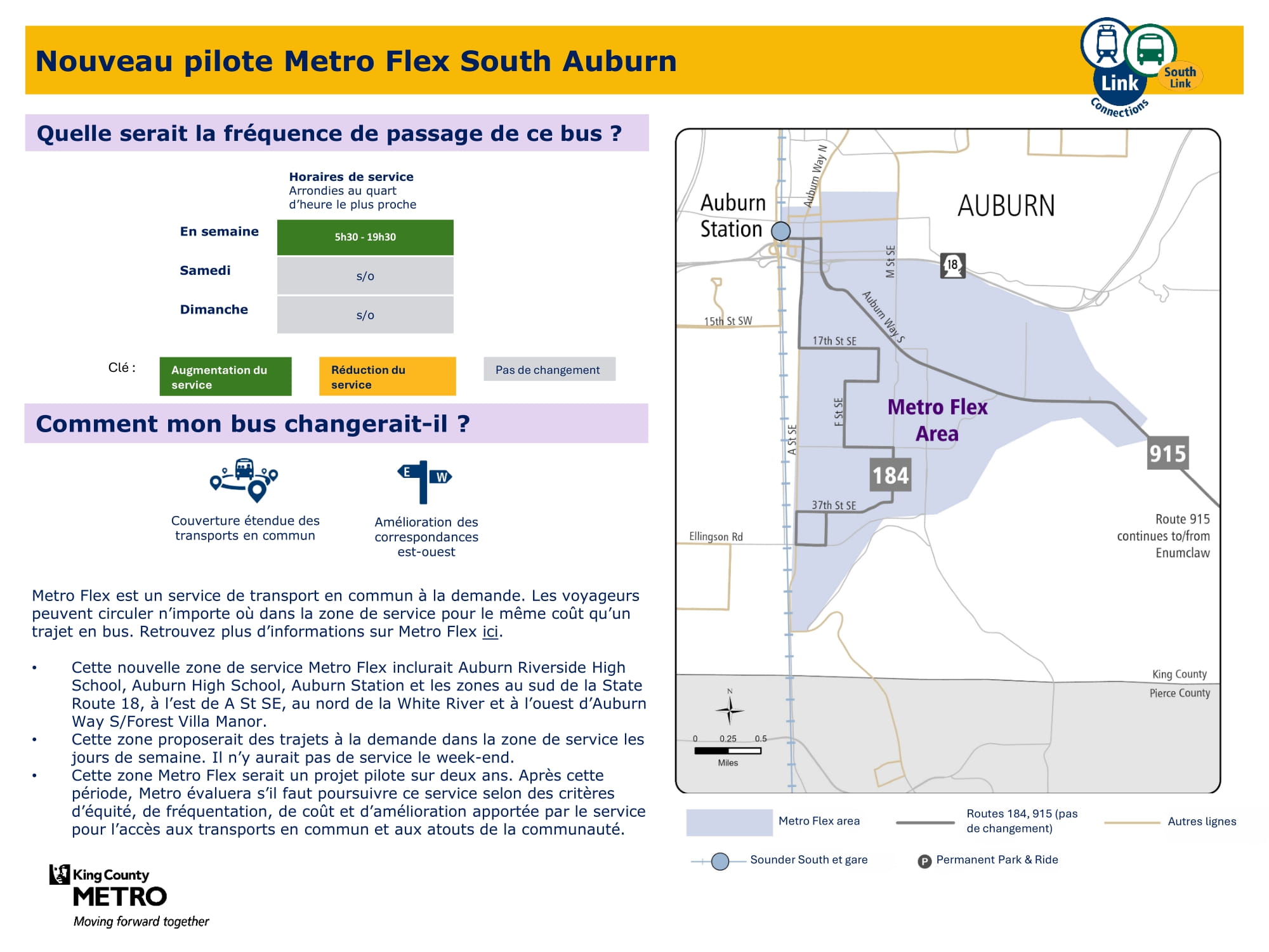 | Pilote Metro Flex South Auburn Dessert Auburn | Nouvelle zone pilote Metro Flex offrant un service à la demande du lundi au vendredi. Dessert les zones situées au sud de la ligne nationale 18, à l'est de A Street SE, au nord de la White River et à l'ouest de Auburn Way S/Forest Villa Manor. Y compris la stationAuburn et Riverside High School. |