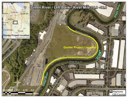 The Gunter Levee is located in the City of Tukwila along the west left bank of the Green River when looking downstream and reduces flood risks to commercial areas of Tukwila.