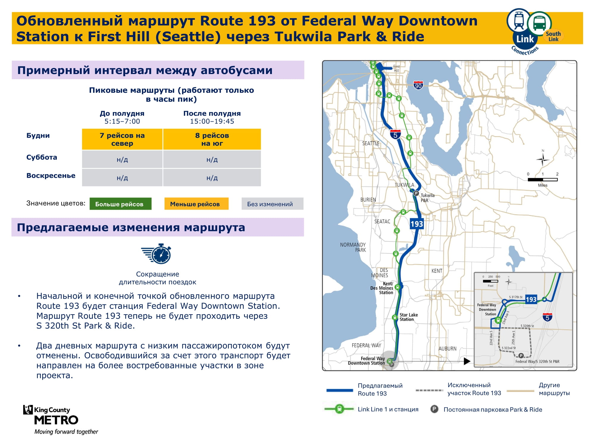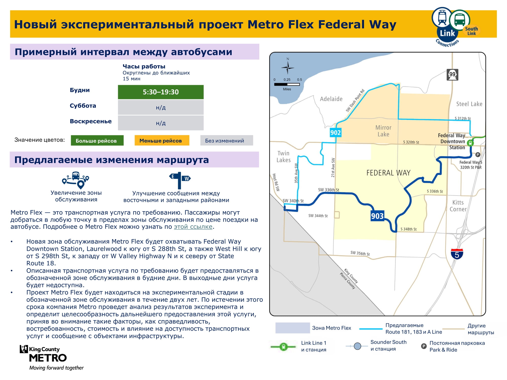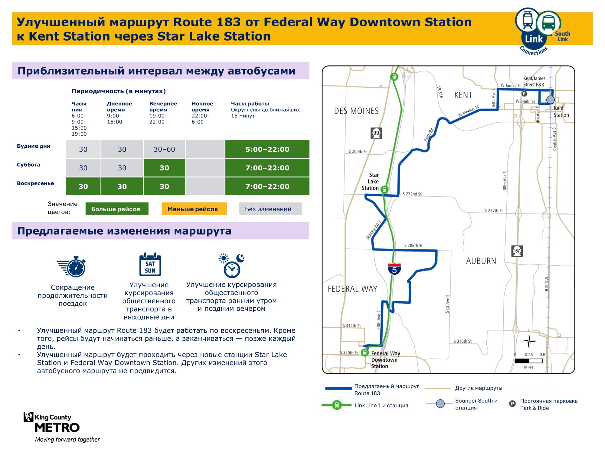 В связи с расширением сети легкорельсового транспорта Link на юг и добавлением новых трех станций в городах Kent / Des Moines, районе Star Lake и центре города Federal Way целью проекта South Link Connections является улучшение возможностей передвижения общественным транспортом для жителей сообществ в южной части округа Кинг. Сотрудничая с транспортным управлением Sound Transit (Откроется в новой вкладке) и другими партнерами, транспортная компания Metro создала новую сеть общественного транспорта, учитывая отзывы сообщества.