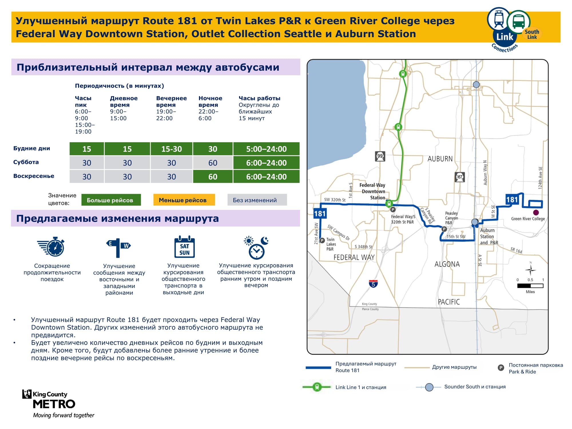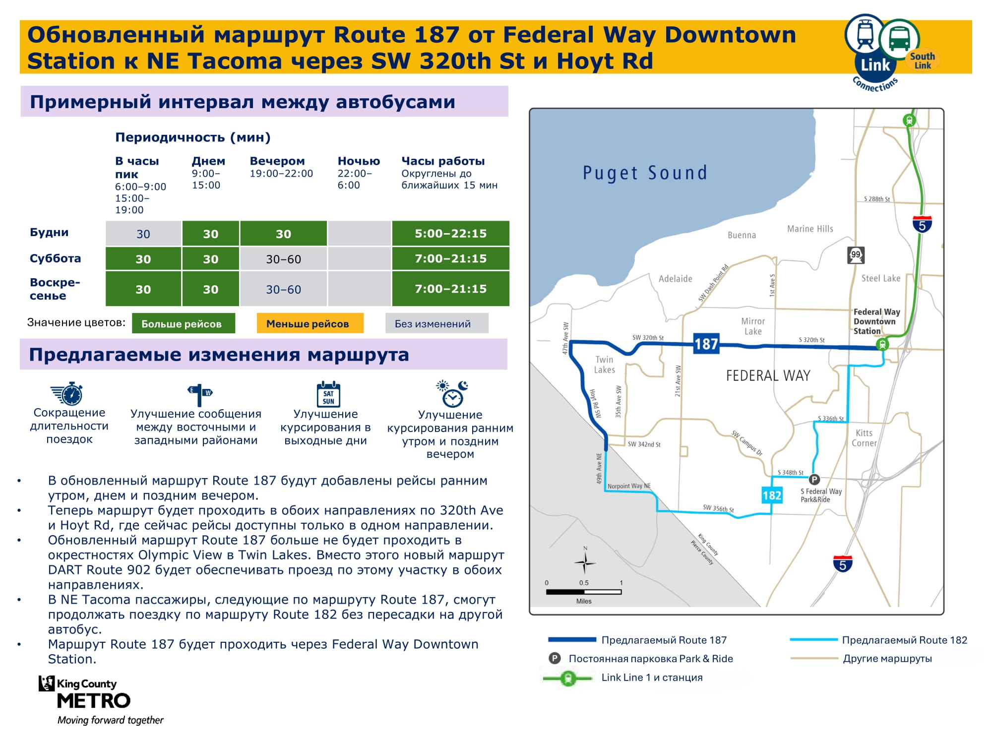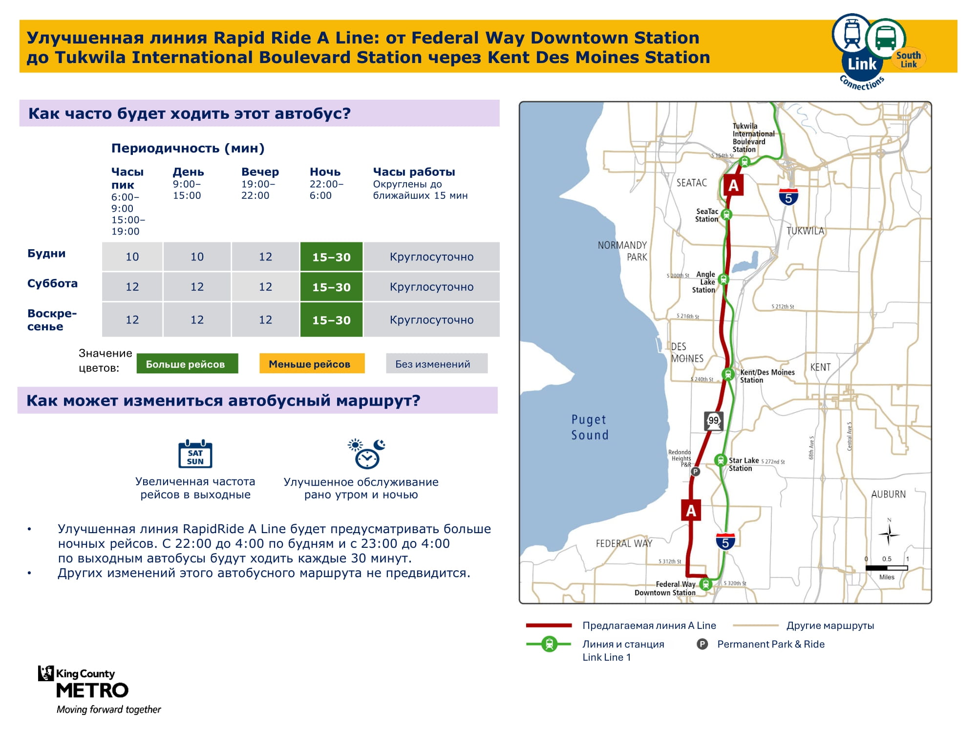 В связи с расширением сети легкорельсового транспорта Link на юг и добавлением новых трех станций в городах Kent / Des Moines, районе Star Lake и центре города Federal Way целью проекта South Link Connections является улучшение возможностей передвижения общественным транспортом для жителей сообществ в южной части округа Кинг. Сотрудничая с транспортным управлением Sound Transit (Откроется в новой вкладке) и другими партнерами, транспортная компания Metro создала новую сеть общественного транспорта, учитывая отзывы сообщества.