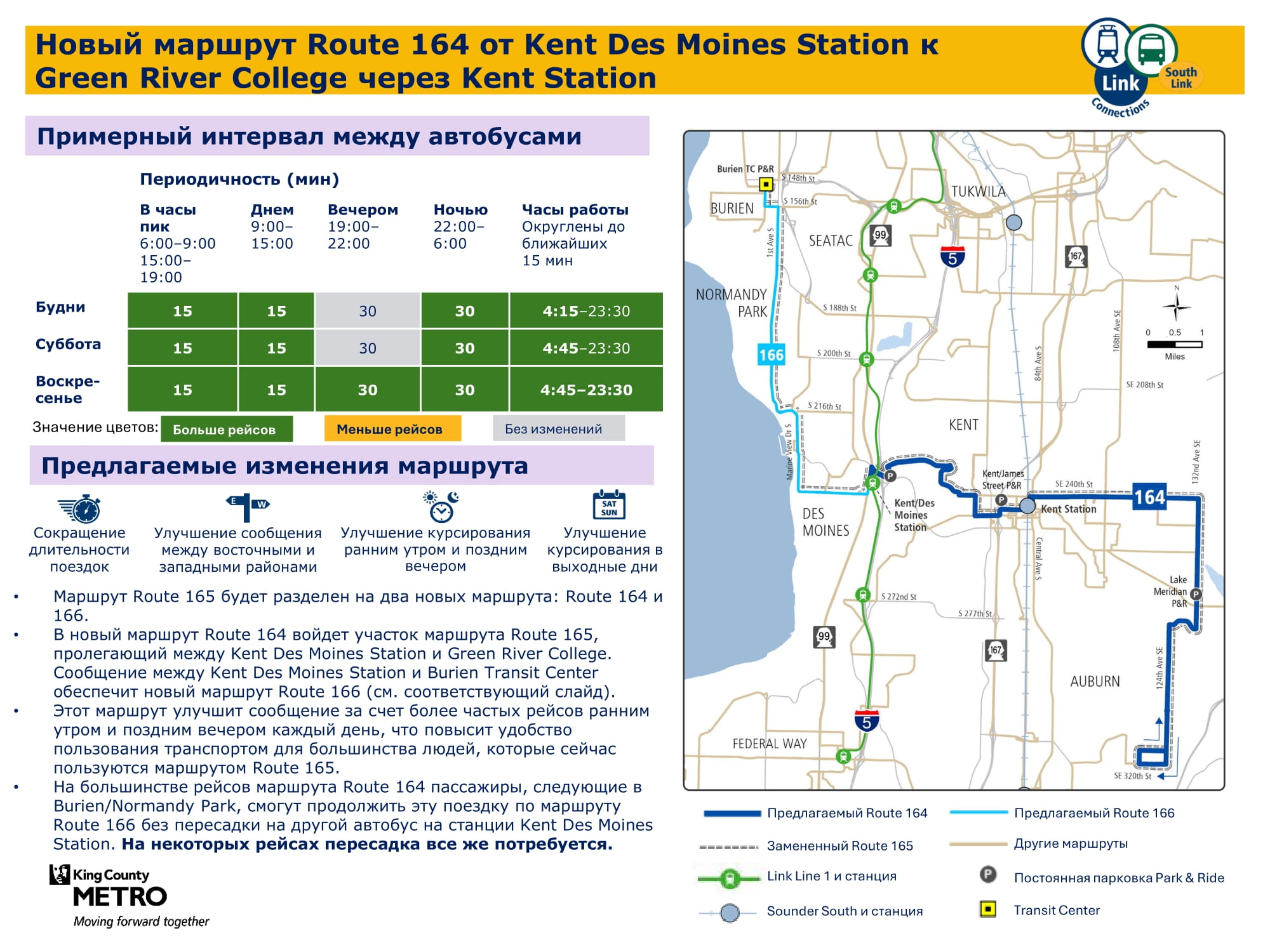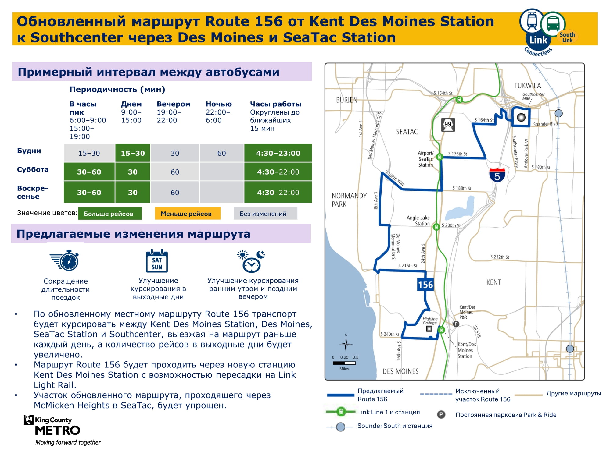 Будет увеличено количество рейсов в течение всей недели. Будет обеспечивать пересадку на легкорельсовый трамвай Link на станции Kent Des Moines и идти по более прямому маршруту через McMicken Heights. |