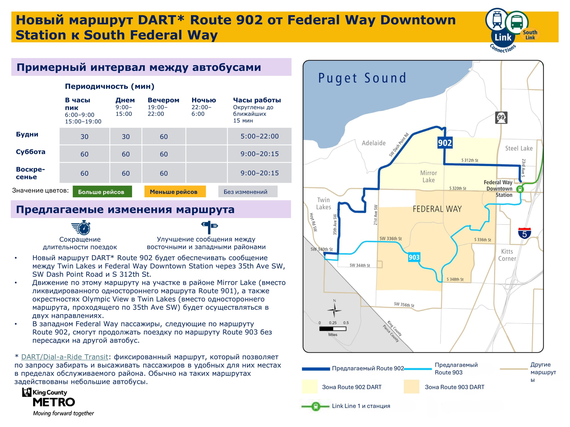 От станции Federal Way Downtown до South Federal Way Новый маршрут DART. Частично заменит маршрут DART 901. Кроме того, будет увеличено количество рейсов на протяжении всей недели. Он будет обеспечивать пересадку на легкорельсовый трамвай Link на станции Federal Way Downtown. |
