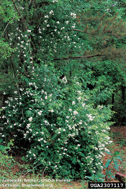 Multiflora rose tolerates a wide range of soil, moisture, and light conditions. It can readily establish in fields, forests, stream banks, some wetlands, and many other habitats. Dense thickets of multiflora rose exclude other beneficial vegetation and may be detrimental to nesting of some native birds. In pastures, multiflora rose can form thickets that exclude livestock and reduce forage areas. Multiflora rose can climb ten feet or more into the lower branches of trees.