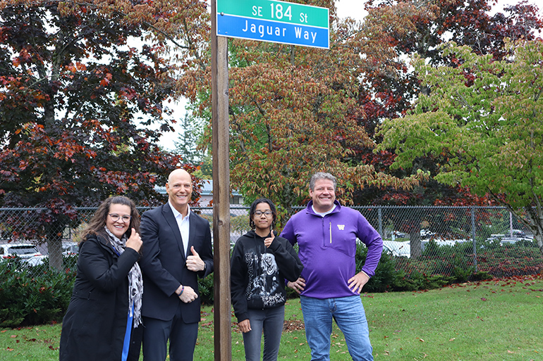 King County Councilmember Reagan Dunn on Tuesday joined staff and students from Northwood Middle School to celebrate the honorary road designation of SE 184th St in Fairwood as Jaguar Way in recognition of the school’s mascot, the jaguar.
