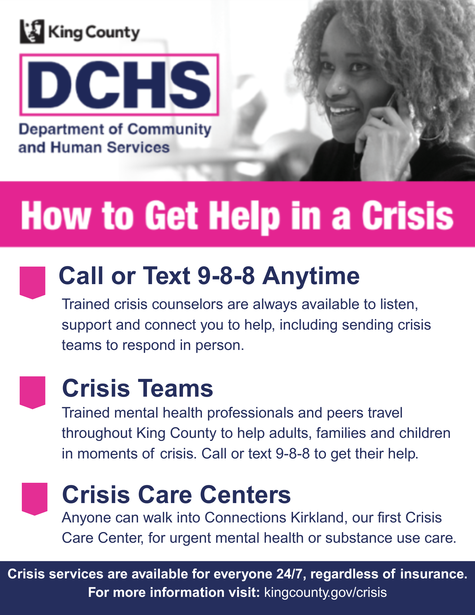Download information about Crisis Care Centers in Spanish, Somali, Vietnamese and Chinese.