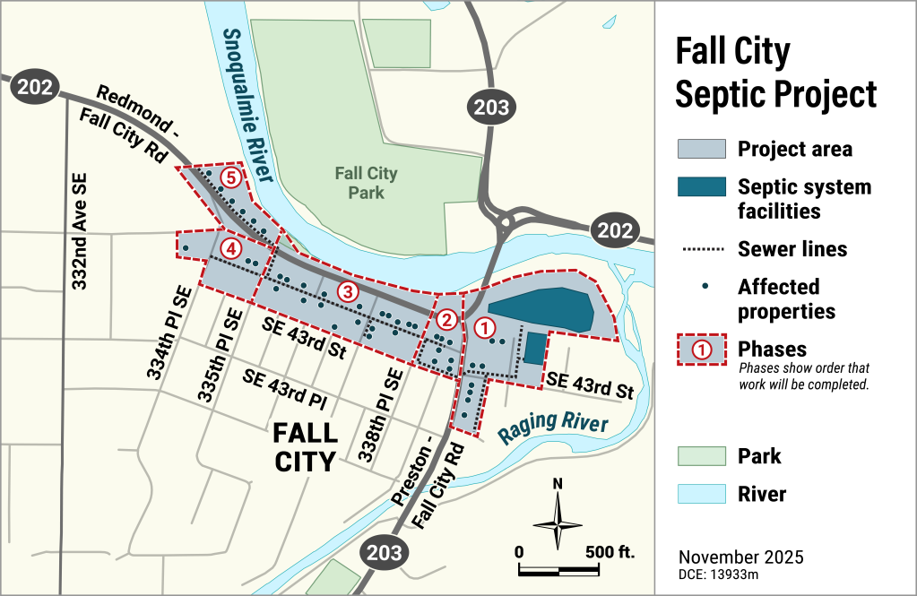 King County truly appreciates the patience and support of everyone in the Fall City Business District as we work to improve local infrastructure. This project will repair all failing and non-conforming systems, and the new system will provide capacity for conservative growth in the business district and treat waste to the highest quality standards required by the Washington State Department of Health.