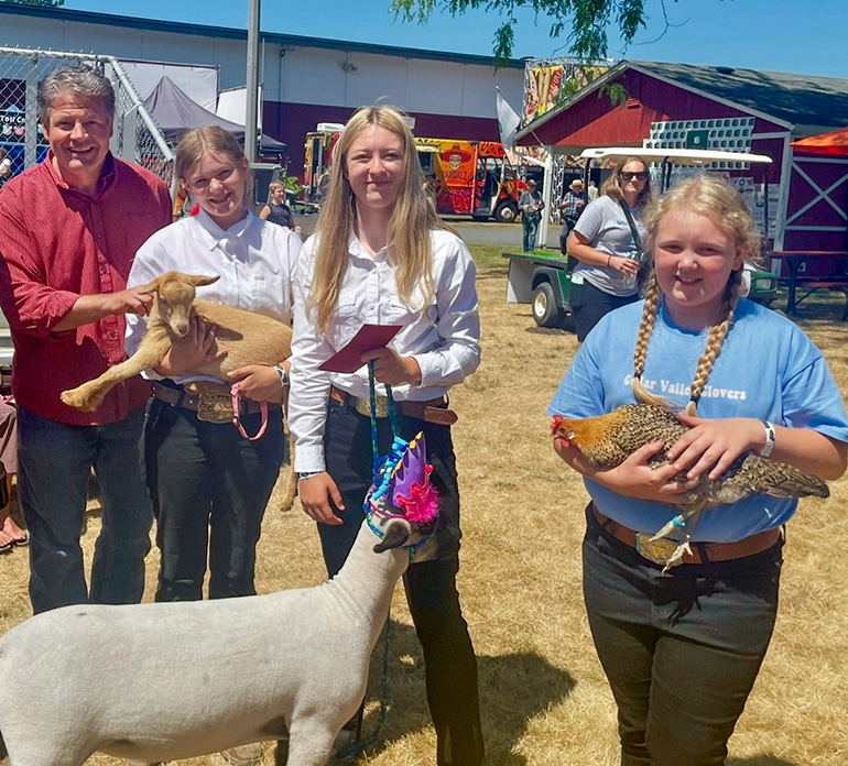 ‘Oklahoma’, the Hampshire/Suffolk Cross Lamb owned by Scarlett Cockerham, was awarded the locally prestigious title of ‘King Critter’ by King County Councilmember Reagan Dunn at the King County Fair this year. Standing alongside Enumclaw Mayor Jan Molinaro, Dunn also announced two honorable mentions — Rue the Nigerian Dwarf Goat owned by Sydney Ball, and ‘Honey Bun,’ a Sicilian Buttercup Chicken owned by Vivian Cockerham.
