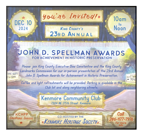 The John D. Spellman Awards recognize achievements in historic preservation. The awards are presented once a year by the King County Executive. Spellman was the first King County Executive and 18th governor of Washington. He established the County’s Historic Preservation Program in 1980.