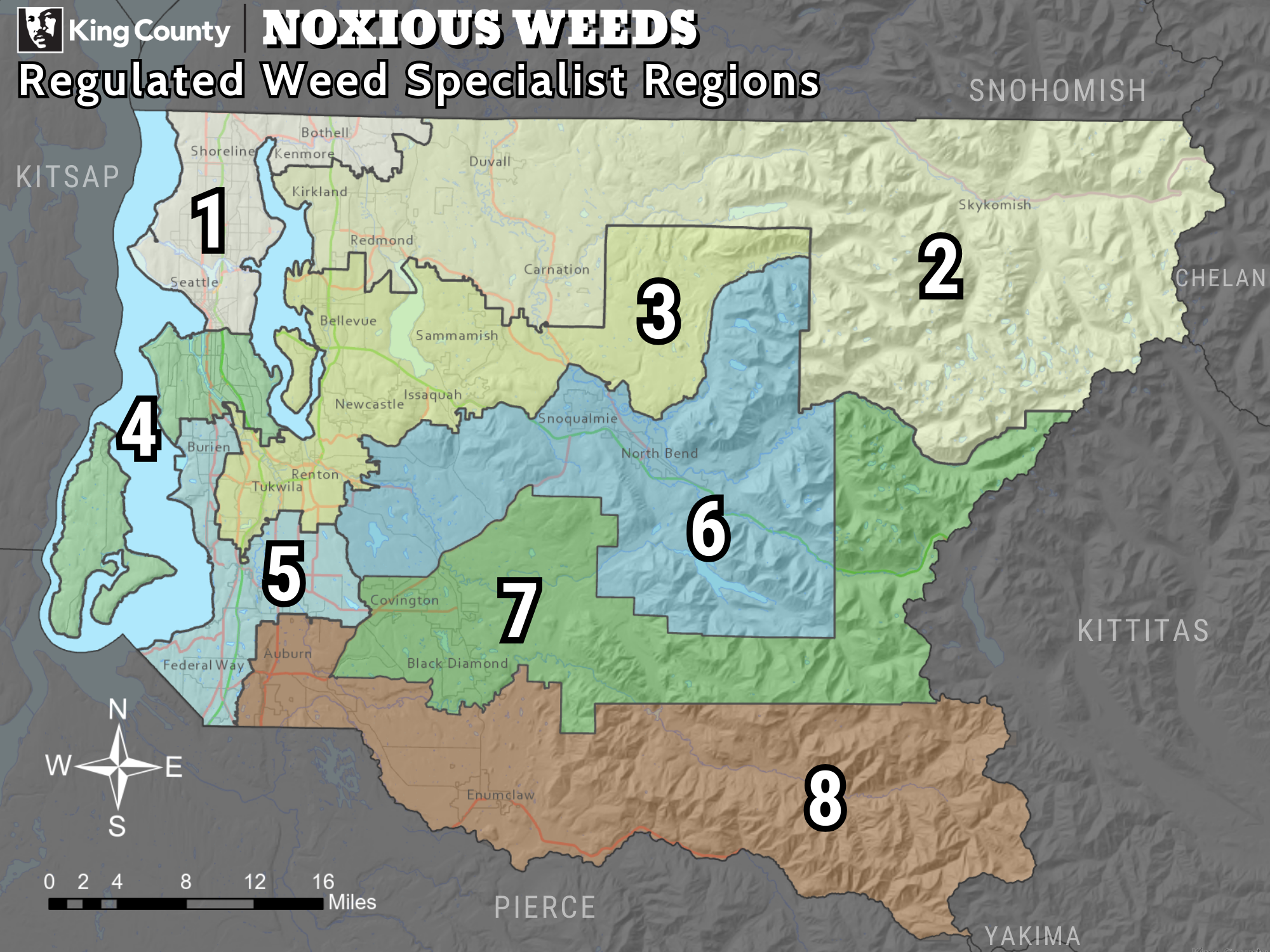 The King County Noxious Weed Control Program monitors and manages the control of regulated weeds with the help of landowner cooperation and stewardship. Regulated weeds are managed by Program specialists on a regional basis within the county. Learn more about how the Program’s regulated weed control team operates below.