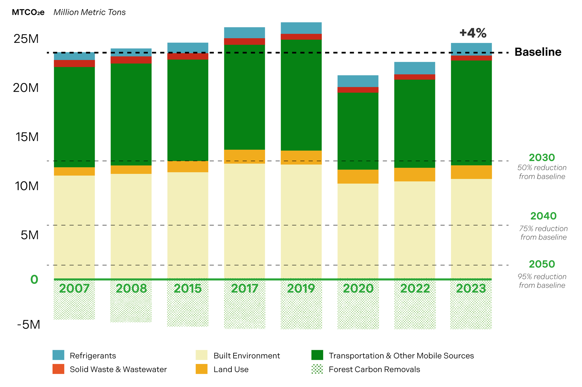 - Total geographic emissions increased 4% as compared to 2007 and decreased 8% in recent years from 2019 to 2023.