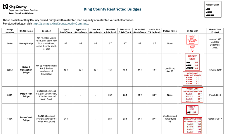 Many vehicles like school buses, fire engines and ambulances are still allowed depending on their weight and the loads they carry. We continue to update fire districts if and when there is a weight restriction or a new one is put in place. Truck companies and agencies can email the county at permits.roads@kingcounty.gov with questions and requests about specific bridges. Inquiries should include information about truck weights, including the weight of any loads, and information on how the vehicle distributes the weight (spacing between each axle and loads on each axle). If the truck, fully loaded, exceed legal loads, or posted load signs, companies or agencies can apply for “over legal load” permits. More about overlegal load permits.
