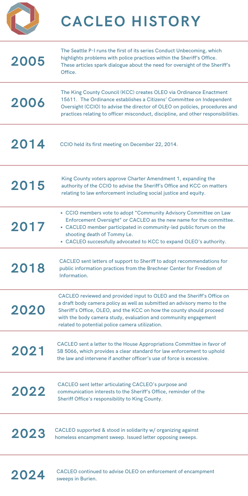 The Community Advisory Committee for Law Enforcement (CACLEO) offers input on law enforcement policies and procedures. It advises the King County Sheriff's Office (Sheriff's Office) and King County Council on equity and social justice in policing. It also provides public resources on alleged police misconduct and does outreach to communities served by the Sheriff's Office.
